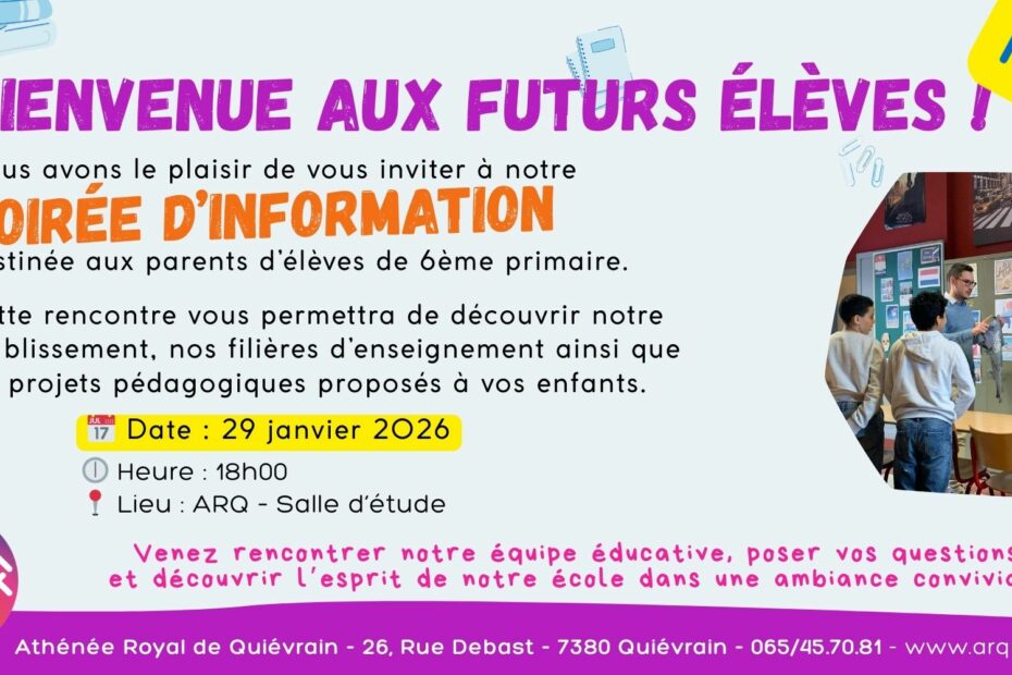 Nous vous invitons à une soirée d’information destinée aux parents d’élèves de 6e primaire, afin de découvrir notre établissement, nos filières d’enseignement et nos projets pédagogiques. 📅 Date : Jeudi 29 janvier 2026🕕 Heure :… Soirée d’information – Parents de 6e primaire (29 janvier 2026)